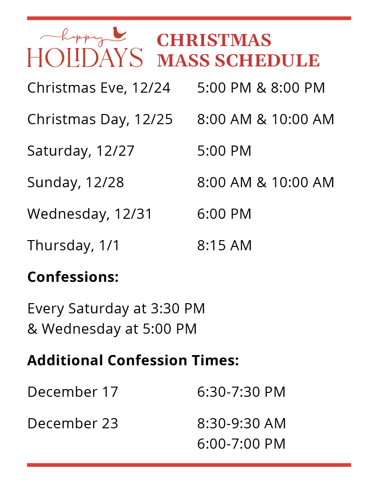 8:15 am - Mass | 5:00 pm - Confessions | 6:00 pm - Mass
