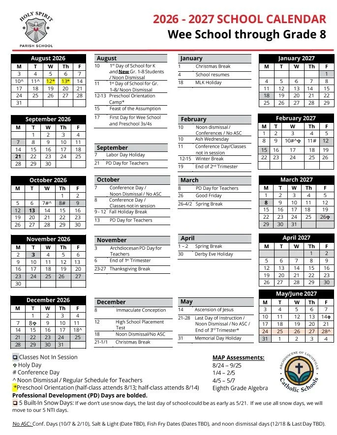 School Calendar View fullsize View fullsize 2025-26 School Calendar2025-26 Kindergarten - Gr. 8 Calendar (PDF)2025-26 Wee School / PreK Calendar (PDF) View fullsize 2026-27 School Calendar.2026-27 Wee School - Gr. 8 Calendar (PDF)